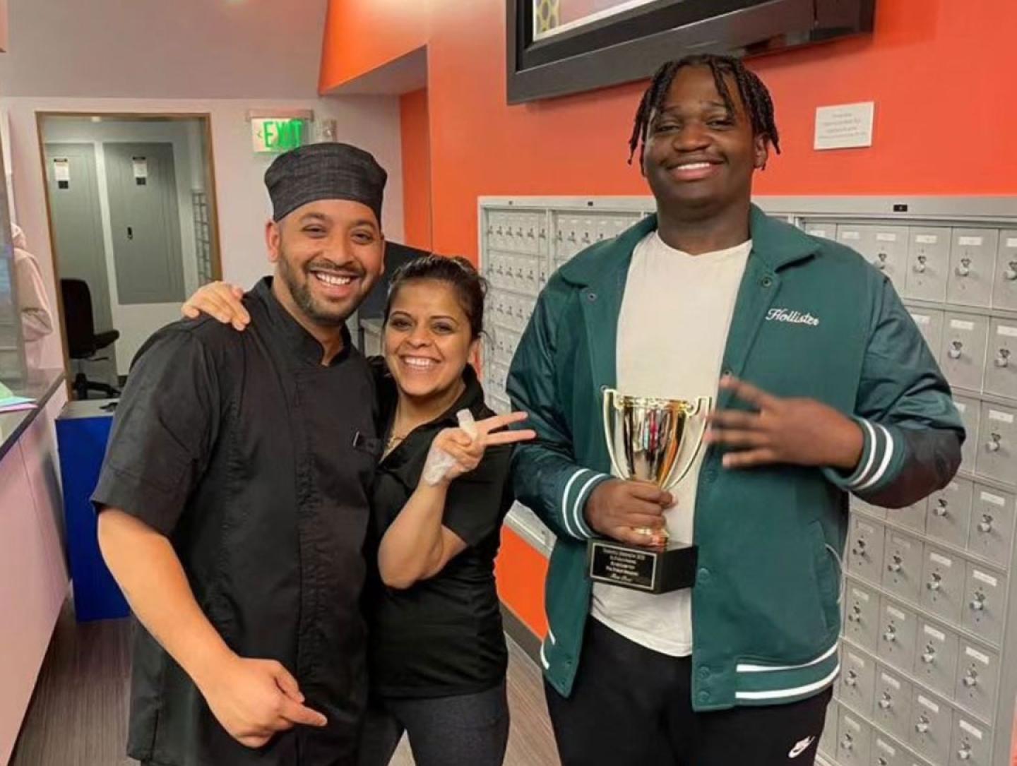 Johnson stopped by Kwok Café to share his victory with cafe employees Vishal and Pooja.